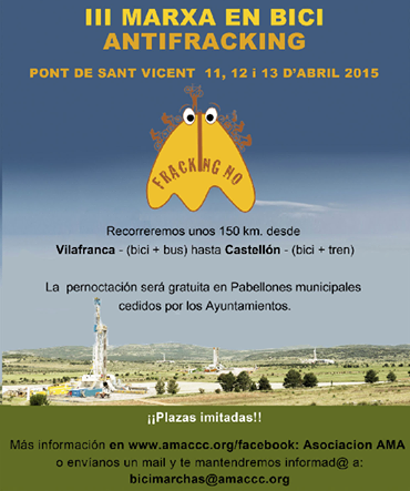 Hablamos con Gassan de la Asociación por el Medio Ambiente y contra el cambio climático(AMA), sobre la III Marcha en bici anti-fracking que durante los dias 11, 12 y 13 de abril recorrerán diversas comarcas de Castellón, donde 42 municipios se pueden ver afectados por tres proyectos de extracción de hidrocarburos, con la técnica de la fractura hidráulica(fracking). Entrevistamos a Esteban Doménech de la Plataforma anti-fracking de Castelló, nos relata en que consiste, y como colectivos ecologistas se están organizando desde hace más de dos años contra esta peligrosa técnica de extracción de hidrocarburos.