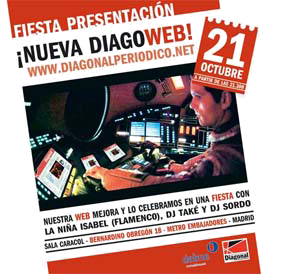 Diagonal mejora su web y quiere celebrarlo. La fiesta tendrá lugar el 21 de octubre en la sala Caracol, Calle Bernardino Obregón 18 de Madrid, con la actuación de La Niña Isabel, DJ Take y DJ Sordo.