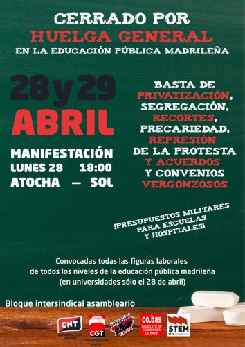En esta edición del 23 de abril 2025 hablamos con docentes de algunos de los sindicatos convocantes de las jornadas de huelga en la enseñanza pública madrileña del 28 y 29 de abril de 2025 para conocer las reivindicaciones y el estado actual de la enseñanza en la Comunidad de Madrid. Contamos en el programa con Hugo de CNT, David de CGT y con Sergio y Cecilia de STEM.